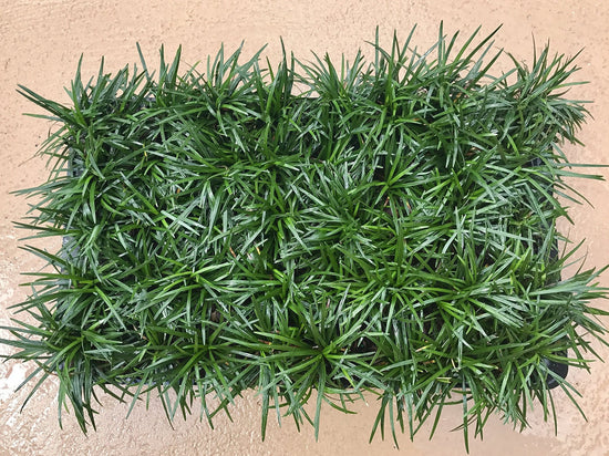 40 count trays of fully rooted 2" Dwarf Mondo Grass or botanical name Ophiopogon japonicus 'Nanus'. Creates a lush groundcover of dense, dark green grass-like clumps. This dwarf is only half the size of the species. Excellent as an edging plant or tucked into rocks for a pleasing contrast.