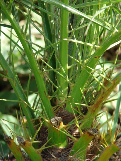 It has upright green branches covered with long slender leaflets. The branches curve towards the top to provide an elegant open crown. It will wave hello to your guests and neighbors as they pass by, making them jealous of its beauty. In warmer climates, you may even see your Pygmy Date Palm bloom with small, creamy white flowers, giving Pygmy Date Palms a unique, eye-catching look.