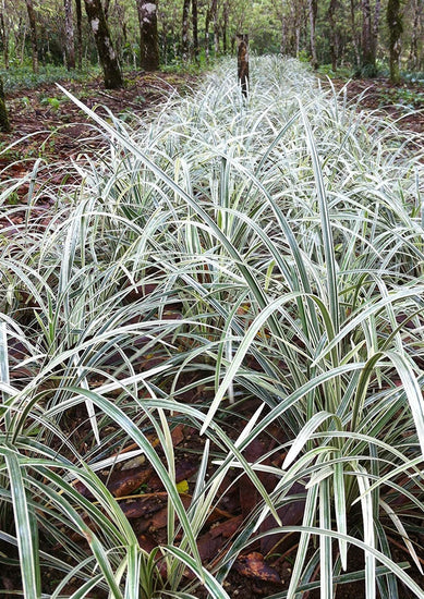 While not native to North American, this clumping ornamental grass makes a nice evergreen groundcover for Florida landscapes. Spikes of small, white flowers appear in summer, followed by black fruits which stand out among the light colored foliage.